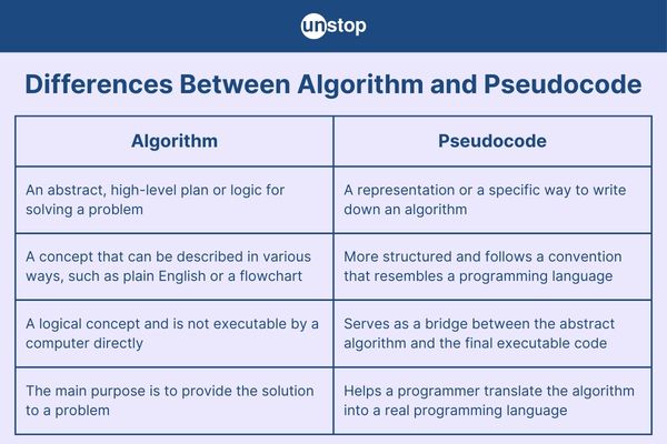To begin, let us take a look at some of the key differences between an algorithm and pseudocode: