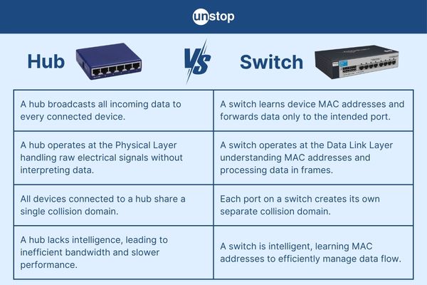 In this section, we will elaborate on a few key differences between hubs and switches: