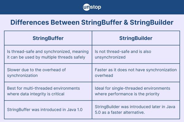 To begin, let us study some of the key differences between StringBuilder and StringBuffer: