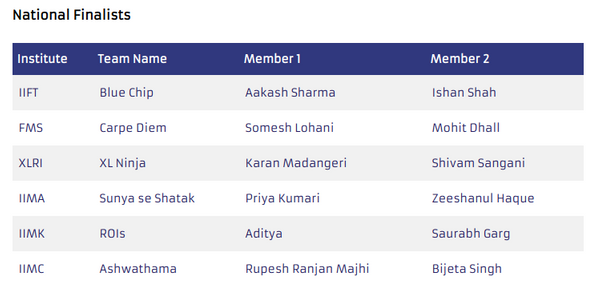 There were a total of six teams in the National Finale. Every team brought a different perspective on the case. But the team from IIM Ahmedabad called ‘Sunya Se Shatak’, was, in our opinion was our toughest competitor. Their analysis and flow of presentation were best among all the participating teams. The solution was very well formulated and it could be linked to desired outcomes with ease.