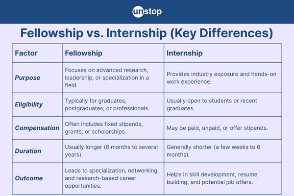 The table below highlights the key benefits of both fellowships and internships, including skill development, networking opportunities, and career growth.