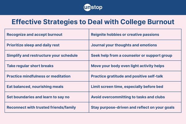Let’s now explore 10 effective strategies to help you overcome college burnout and reclaim your energy, focus, and motivation: