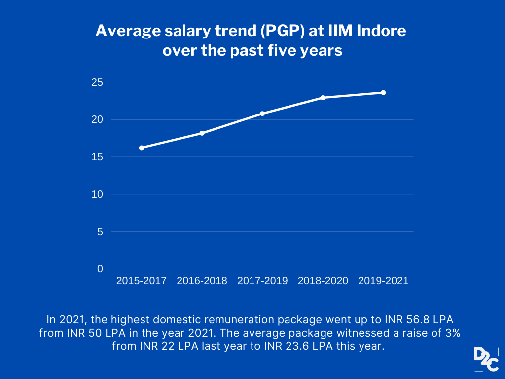 - The highest homegrown compensation at IIM Indore remained at INR 41.50 LPA, while the most elevated international remuneration package touched a whopping INR 56.80 LPA for the PGP batch