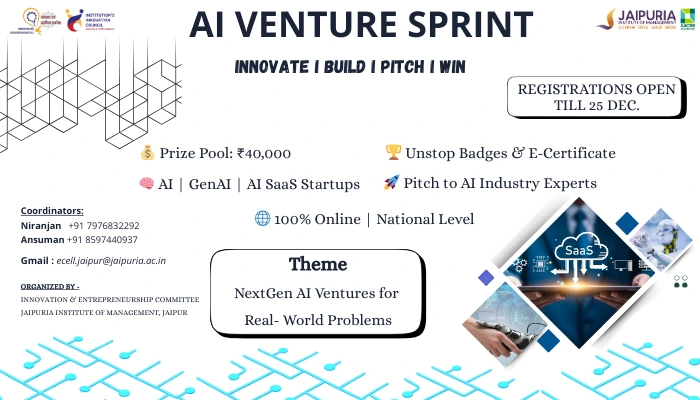 - Innovation and Entrepreneurship Committee (IEC), Jaipuria Institute of Management, Jaipur presents AI Venture Sprint, a national-level AI-based entrepreneurship competition hosted on Unstop