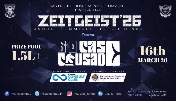Case Crusade 6.0 is the flagship case competition of Zeitgeist 2026, hosted by the Department of Commerce, Hindu College, University of Delhi, in collaboration with Consult Club, IIM Ahmedabad as the Knowledge Partner, and the Institute of Chartered Accountants of India (ICAI) as the Associate Partner.
