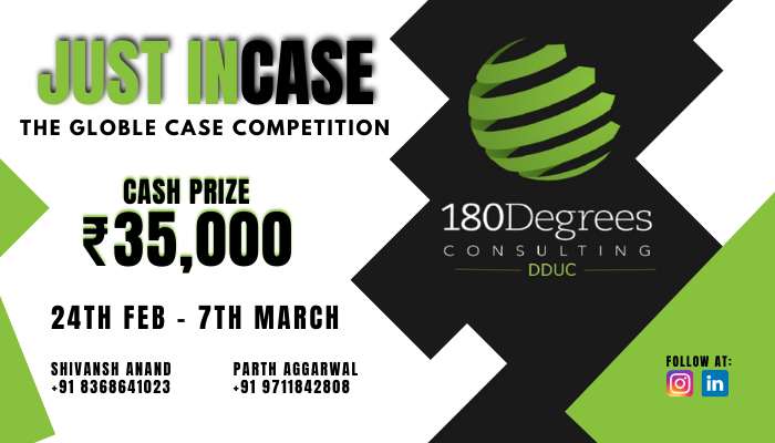 180 Degrees Consulting, Deen Dayal Upadhyaya College presents Just inCase, the global case competition to be held from 24th February 2021 to 7th March 2021 with a cash prize of ₹35,000 ~US $480.