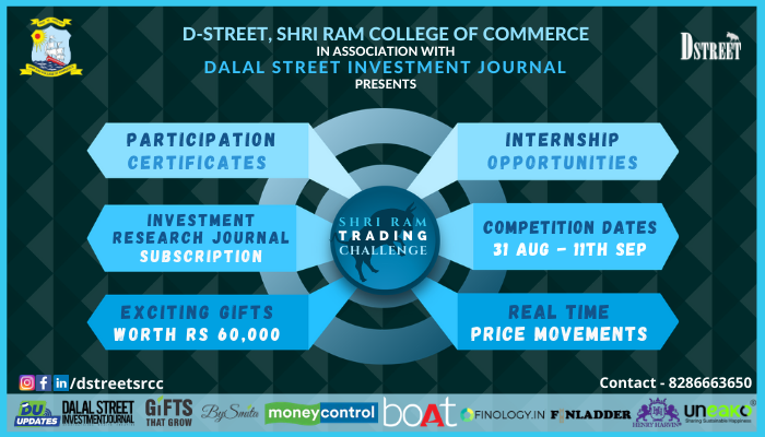 D-Street, SRCC is proud to present Shri Ram Trading Challenge, an online mock-stock competition, in which the participants would be trading on a virtual platform with virtual currency, but with real stocks and live price movements.