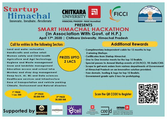 “Smart Himachal Hackathon 2020” is a competition in collaboration with the Government of Himachal Pradesh. It aims to identify disruptive and non-disruptive technological innovations for solving the challenges faced by the Public/ Businesses/Industry in the state of Himachal Pradesh. This initiative aims to institutionalize a model for harnessing the creativity and technical expertise of students and innovators which would, in turn, inculcate a culture of product innovation and a mindset of problem-solving among the youth. The event aims to boost the youth to create innovative ideas in the organized and unorganized sector.