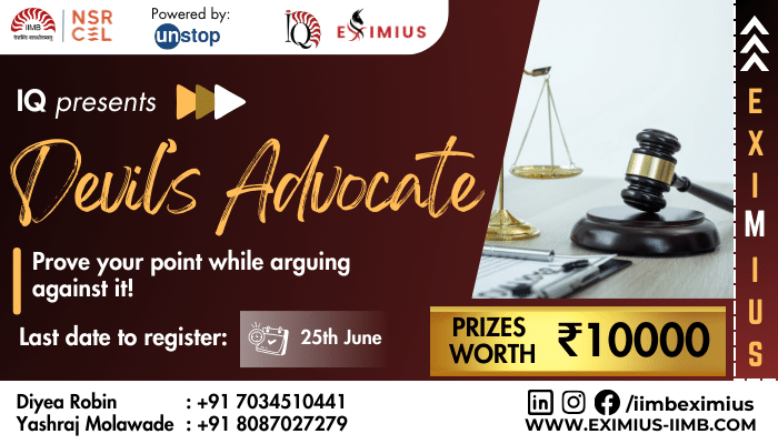 - All decisions in matters of eligibility, authenticity, and final judgments will be with the organizing committee of Devil's Advocate, Indian Institute of Management, Bangalore