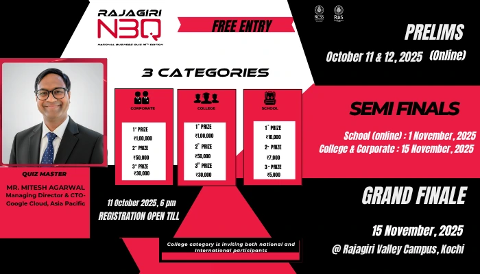 Rajagiri College of Social Sciences and Rajagiri Business School are thrilled to invite you to the highly anticipated 16th edition of the Rajagiri National Business Quiz! Join us for an intellectually stimulating experience led by our esteemed Quiz Master, Mr. Mitesh Agarwal, Managing Director of Solutions & Technology (Asia-Pacific), Google Cloud.