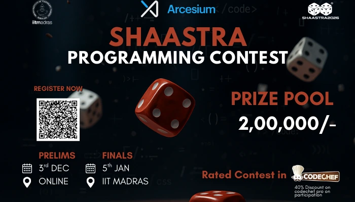 Gear up for Shaastra Programming Contest SPC '26. IITM's Ultimate Coding Showdown! Unleash your programming prowess and join the battle of brilliant minds at our adrenaline-fueled Competitive Programming Competition. Crack intricate algorithms, conquer challenging puzzles, and showcase your coding finesse to claim the coveted Code Champion title. Embrace the thrill of the coding arena, where brilliance meets strategy and where legends are born. Are you ready to code your way to glory?