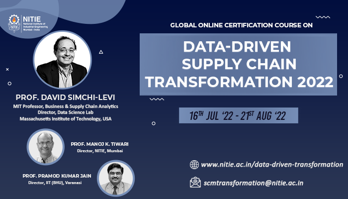 NITIE,Mumbai and IIT (BHU),Varanasi are proud to present the Global Online Certification Course on Data-Driven Supply Chain Transformation 2022 in association with Prof. David Simchi-Levi (MIT, USA) under the leadership of Prof. Manoj K. Tiwari (Director, NITIE Mumbai) and Prof. Pramod Kumar Jain (Director, IIT (BHU) Varanasi), to accelerate the vision of PM Gati Shakti. This digital disruption is now motivating many companies in a variety of industries to reinvent their supply chains, from demand and supply planning to production and distribution. This course introduces Professor Simchi-Levi’s unique framework that combines the three technology trends, digitization, analytics and automation, to reinvent the supply chain. Participants will gain a deeper understanding of :