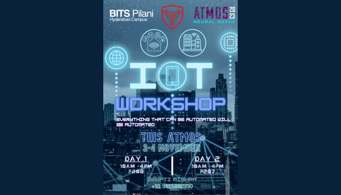Welcome to the annual tech fest, ATMOS, at BITS Pilani, Hyderabad Campus! The Phoenix Association is thrilled to present an exciting opportunity for tech enthusiasts, students, and engineers to dive into the world of the Internet of Things (IoT). We are proud to organize this IoT workshop in collaboration with Robotech Labs, where you'll discover the world of interconnected devices and cutting-edge technology.